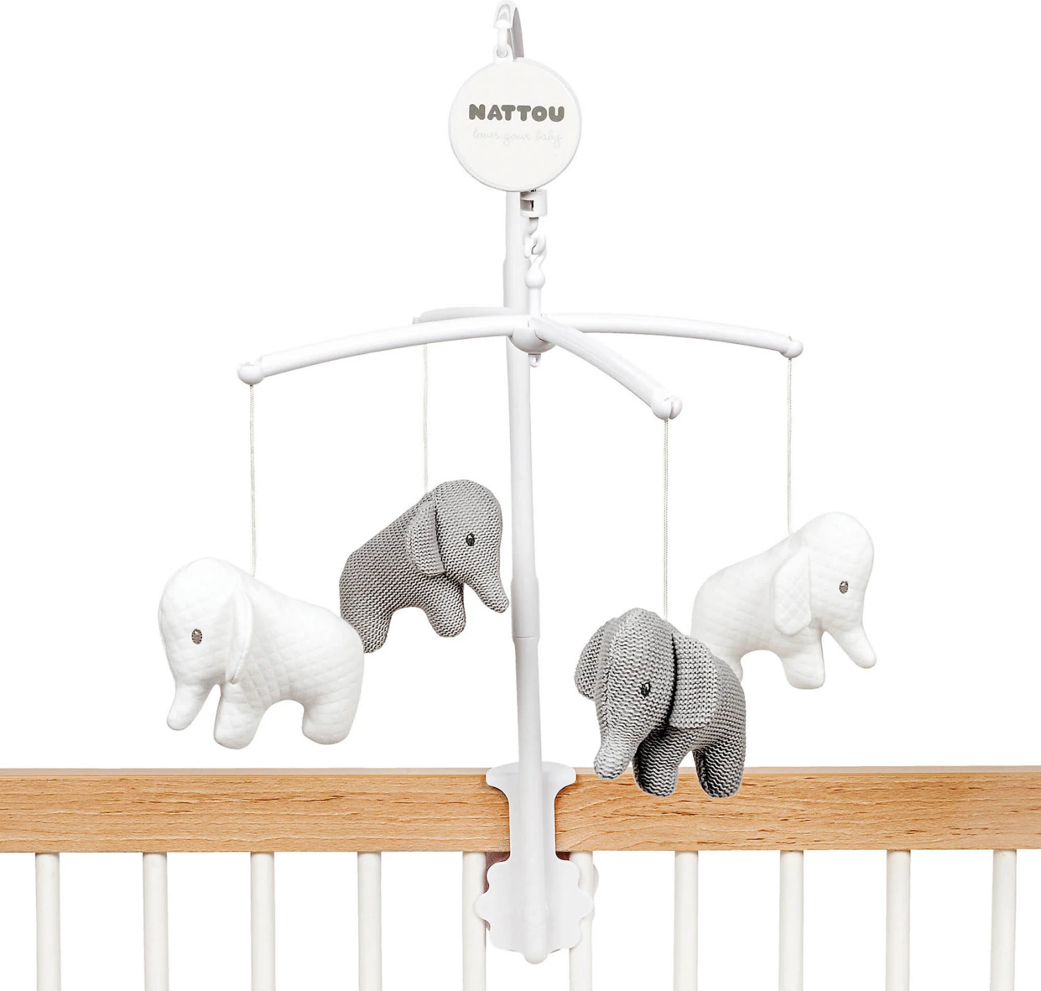 Für kleine Elefanten-Fans: Das Musik-Mobile von Nattou begeistert mit gleich vier Einschlaffreunden. Musik-Mobile Elefant Tembo von Nattou 4 Elefanten-Anhänger Melodie: La Le Lu ab Geburt geeignet Das Musik-Mobile von Nattou lädt zum Beobachten, Lachen und Staunen ein. Vier Elefanten-Anhänger baumeln süß umher. Gefertigt sind sie aus hochwertiger Strickqualität und meliertem Stepp-Stoff. Die sanft erklingende Melodie und die sich drehenden Figuren wirken besonders beruhigend auf Dein Kleines. So gelingt das Einschlafen im Nu. Dank mitgelieferter Halterung kannst Du das Musik-Mobile einfach am Babybett oder am Laufstall befestigen.